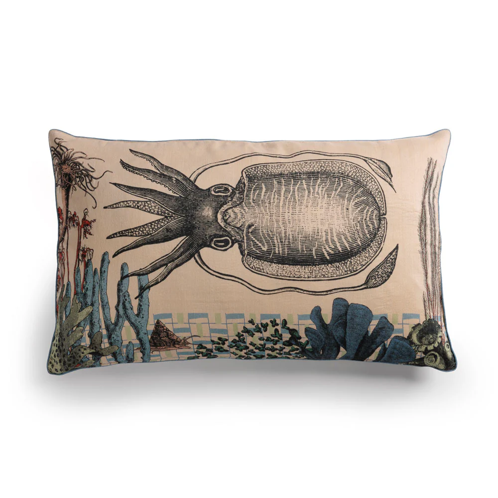 Ajouter à la WishlistPile ou face ? Le coussin Carlo est un malin. Avec son calmar à l’avant et un imprimé géométrique à l’arrière, vous pourrez le disposer recto/verso au gré de vos envies. Il aime se mélanger avec nos autres coussins Bestiaire et la collection Goa pompons en velours de soie pour sublimer les matières.