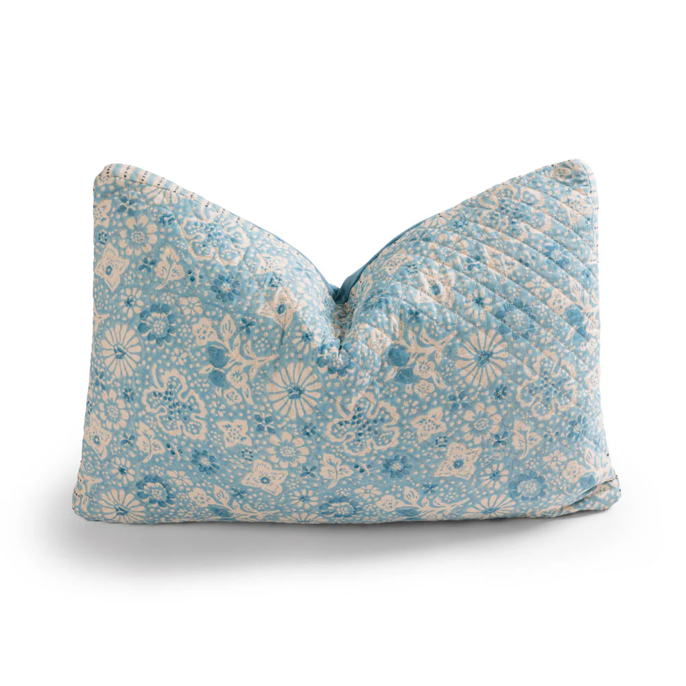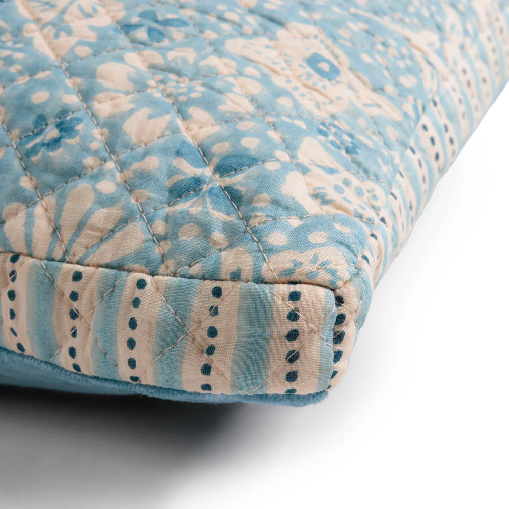 Coussin imprimé suivant la technique du block print. De fabrication 100 % artisanale, chaque pièce est unique et peut présenter certaines irrégularités.