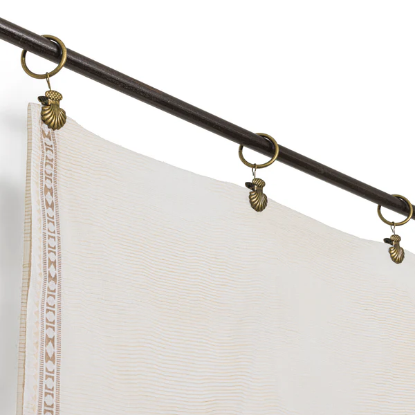 À suspendre à l’aide de nos anneaux pinces noirs ou coquillage (prévoir 10 anneaux par pan). Finition bords frangés.