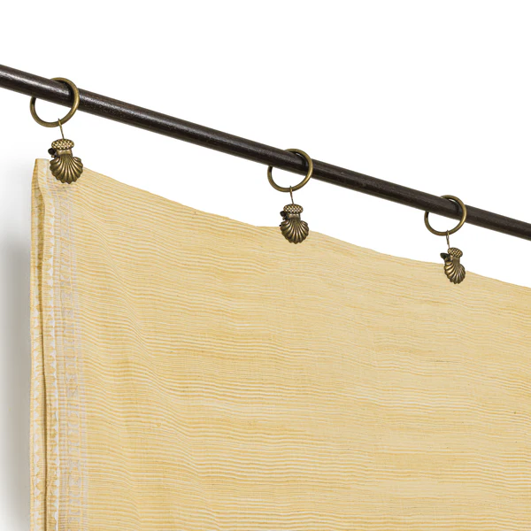 À suspendre à l’aide de nos anneaux pinces noirs ou coquillage (prévoir 10 anneaux par pan). Finition bords frangés.