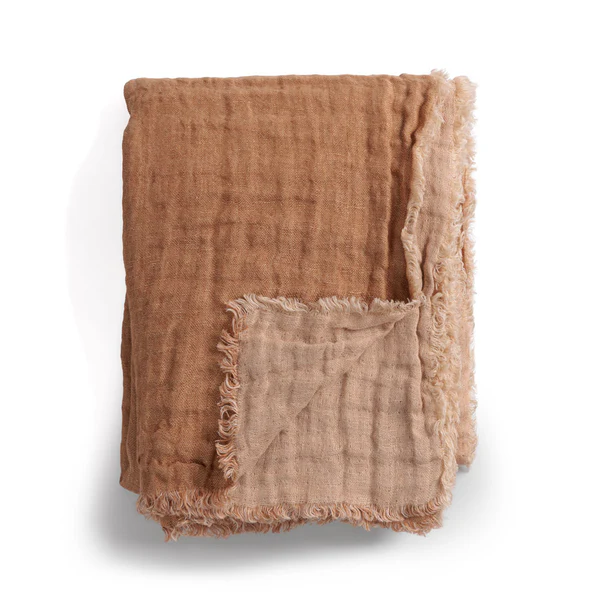 Un plaid en lin lavé gaufré bicolore et réversible, coloris brique/terracota. Aspect froissé et douceur du toucher. Finitions bords à franges.