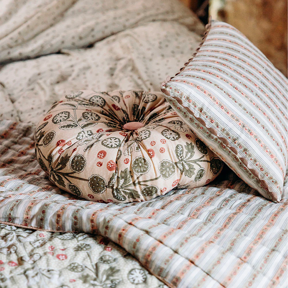 Couvre-lit une place ou jeté de canapé en coton matelassé, le Cosmique marie deux imprimés avec candeur. Réversible, il est imprimé de rayures fleuries d’un côté et d’un imprimé Liberty de l’autre.