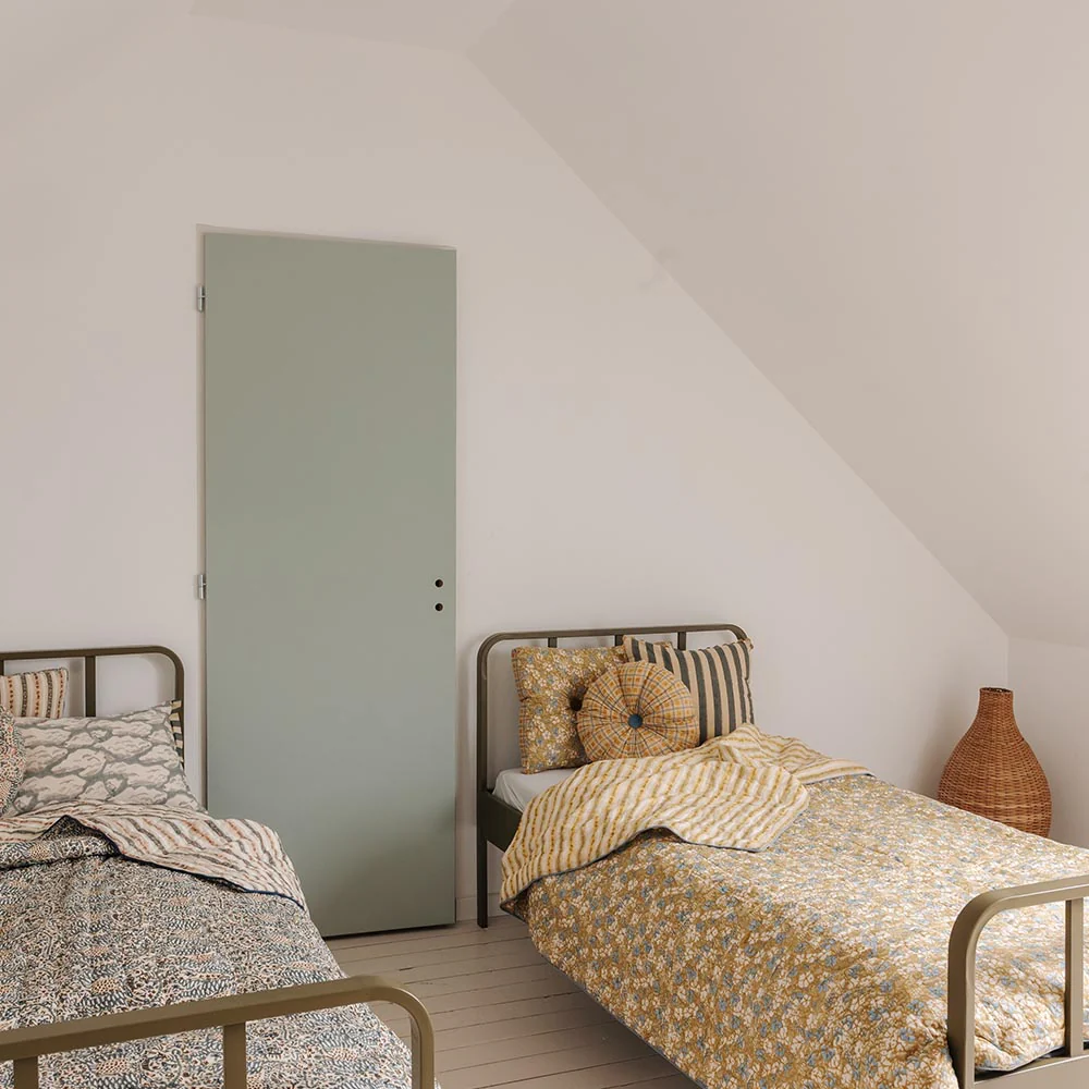 Couvre-lit une place ou jeté de canapé en coton matelassé, le Cosmique marie deux imprimés avec candeur. Réversible, il est imprimé de rayures fleuries d’un côté et d’un imprimé Liberty de l’autre.