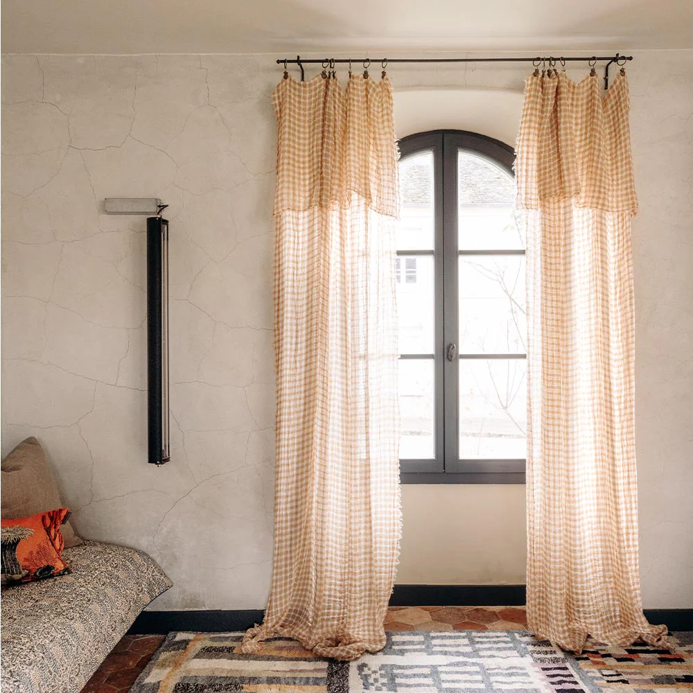 158,00€80,00€Ce panneau ajouré en gaze de lin compose un jeu de carreaux ton sur ton de par son tissage bicolore.…