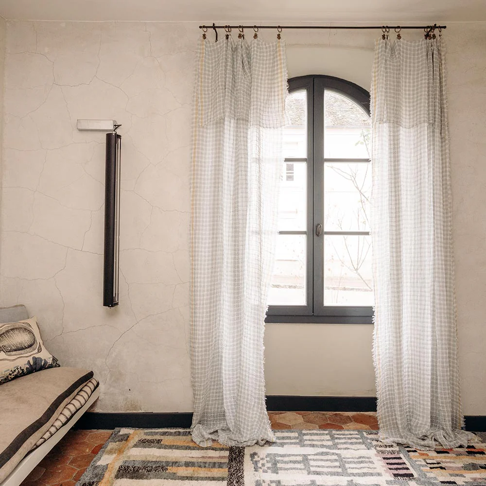 158,00€110,00€Ce panneau ajouré en gaze de lin compose un jeu de carreaux ton sur ton de par son tissage bicolore.…