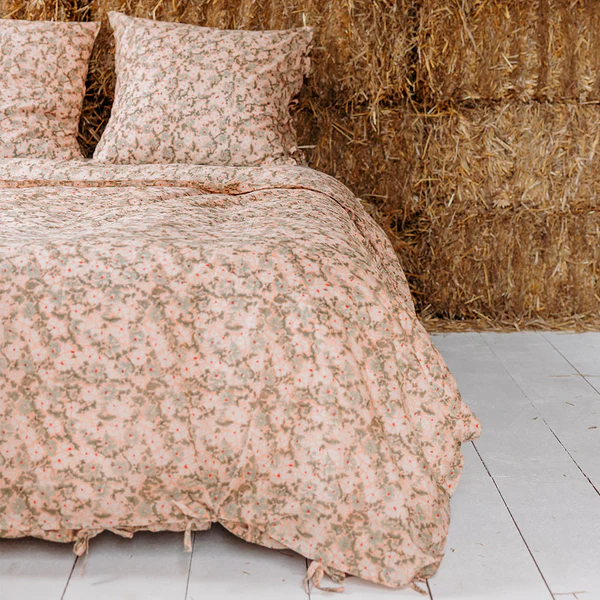 Set comprenant la housse de couette et une taie carrée (lit une place) ou deux (lit deux places). Rabat et fermeture à liens.