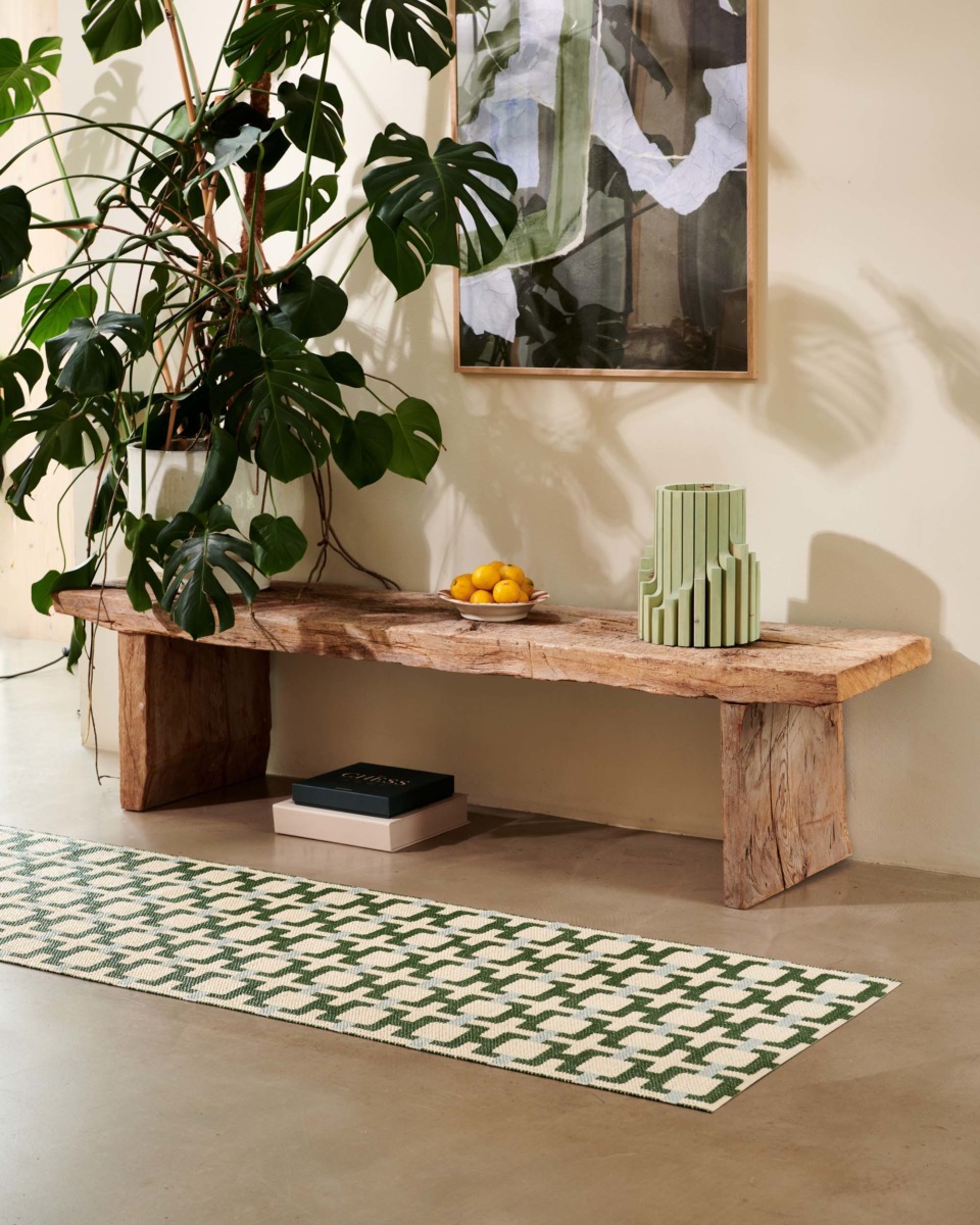 - Passez régulièrement l’aspirateur sur votre tapis et rincez immédiatement toute tache ou tout liquide renversé. Ne frottez pas les taches, car cela peut endommager le matériau. Ne séchez jamais au sèche-linge et veillez à ne pas plier les bords soudés, car ils pourraient s’abîmer. Si le tapis est mouillé, étirez les bords de manière uniforme et suspendez-le toujours pour le séchage sur une barre large ou plusieurs fils afin d’éviter les plis.Pour les largeurs de 60 cm, 70 cm et 85 cm, lavage à la main ou en machine à basse température, maximum 30 °C/85 °F. Ne pas essorer. En règle générale, un tapis jusqu’à 70 × 250 cm convient pour une machine de 6 kg.Pour les largeurs de 140 cm, 180 cm et 230 cm, ne pas laver en machine en raison de la taille. Passez régulièrement l’aspirateur. Nettoyez avec une serpillière, lavez à la main dans une baignoire ou un grand récipient, ou utilisez un nettoyage à sec professionnel. Pour les taches, utilisez un chiffon ou une éponge douce et humide. Ne frottez pas.